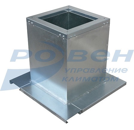 Стакан монтажный представляет собой сборную конструкцию, состоящую из оцинкованной рамы, внутри которой расположены воздуховод квадратного сечения. Боковые стороны рамы закрыты панелями, а между ними и воздуховодом находится термошумоизоляционный материал. Снаружи рамы по контуру выполнены опоры для установки системы на несущую часть кровли.